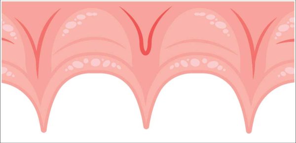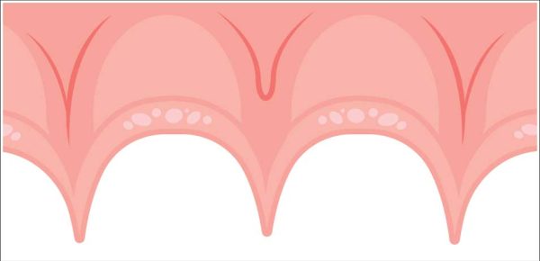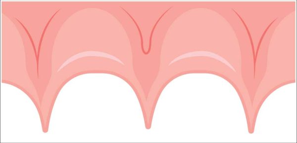 Heavy stippling and texture on gums, accentuated root structures, characterized cervical areas. Frenum is highly present. Greater oral hygiene measures required.